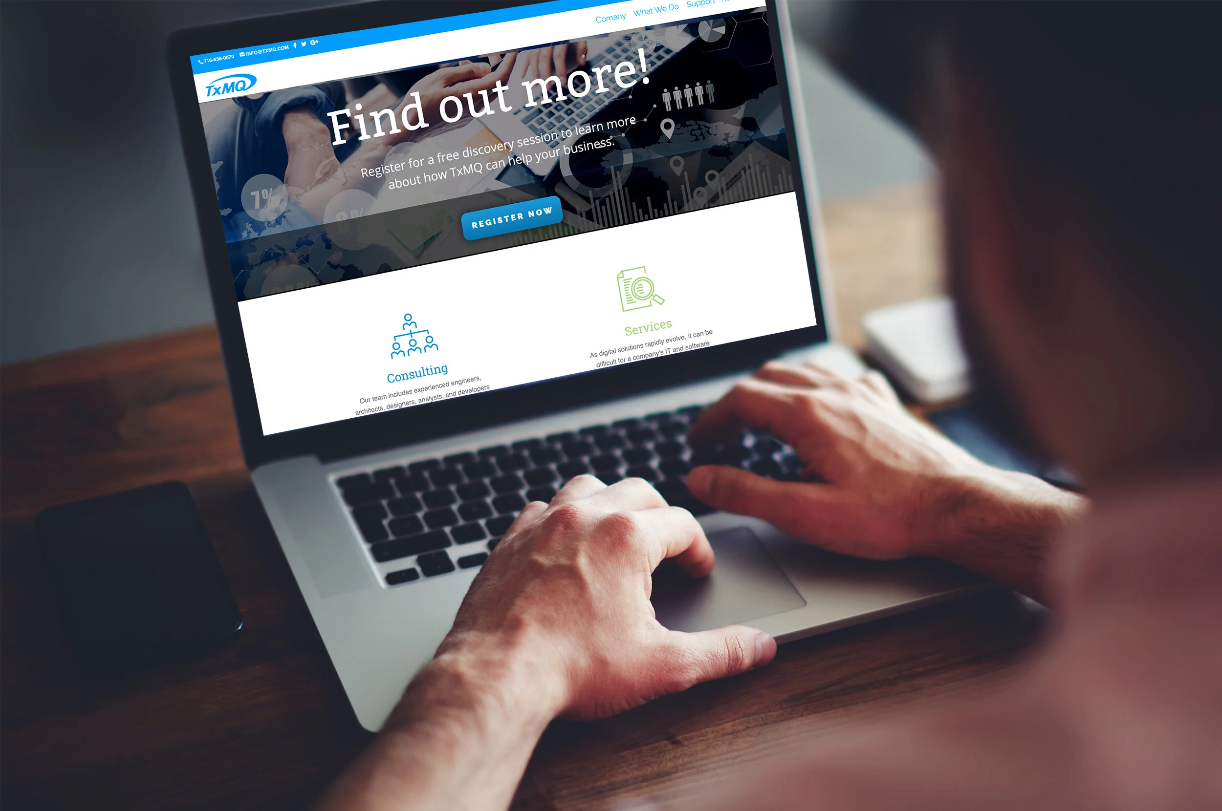 A company focused on core infrastructure technologies, TxMQ’s original website was cumbersome and difficult to navigate. Icons and concise text streamline the homepage to their key offerings, allowing customers to quickly find what they need and then dive deeper.